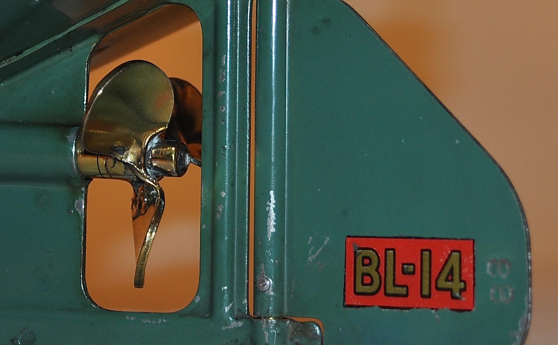 Propeller- the three blade propeller is made of brass and is attached to a shaft that runs through a tube in the hull. Inside the hull the shaft attaches to a gear that meshes with a larger gear attached to the motor.
