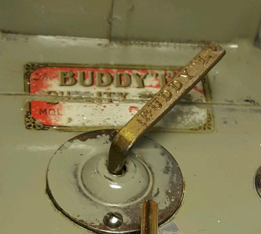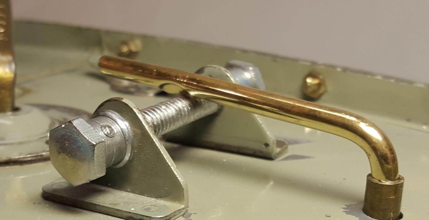 Speed Control- located on the aftdeck, made of steel and painted to simulate brass. Raised lettering- BUDDY “L” on flat top with slightly rounded bottom. It continues through a plate with a raised center that holds a rubber gasket for prevention of water intrusion into the hull. Below the deck it attaches to the regulator which controls the speed of the propeller rotation.